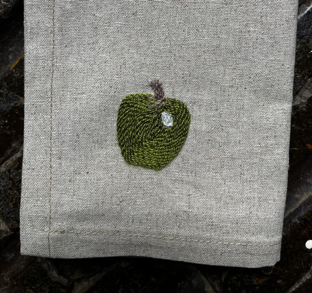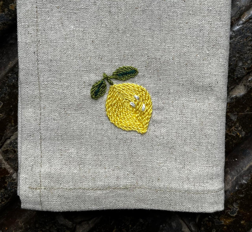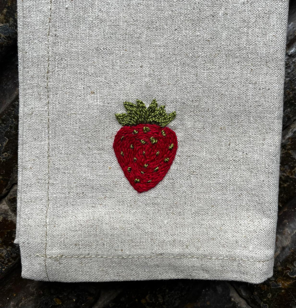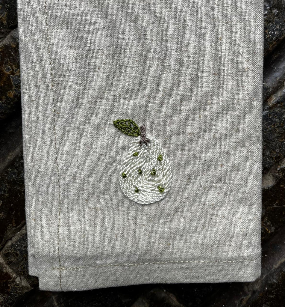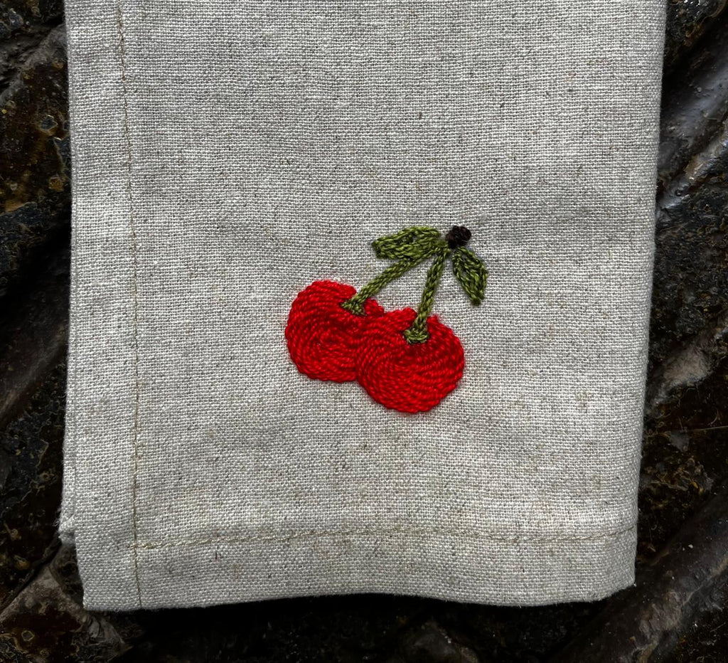 Set of 5 Hand Embroidered Pure Linen Cotton Serviettes - Apple, Cherry, Lemon, Pear, Strawberry